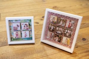 オシャレな風合いのウッドボックスの中に写真が浮かんだように並ぶオシャレなフレームです。